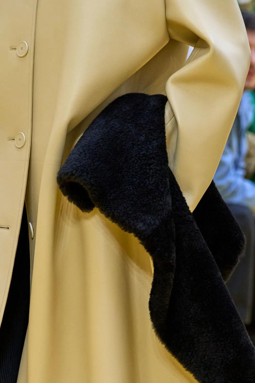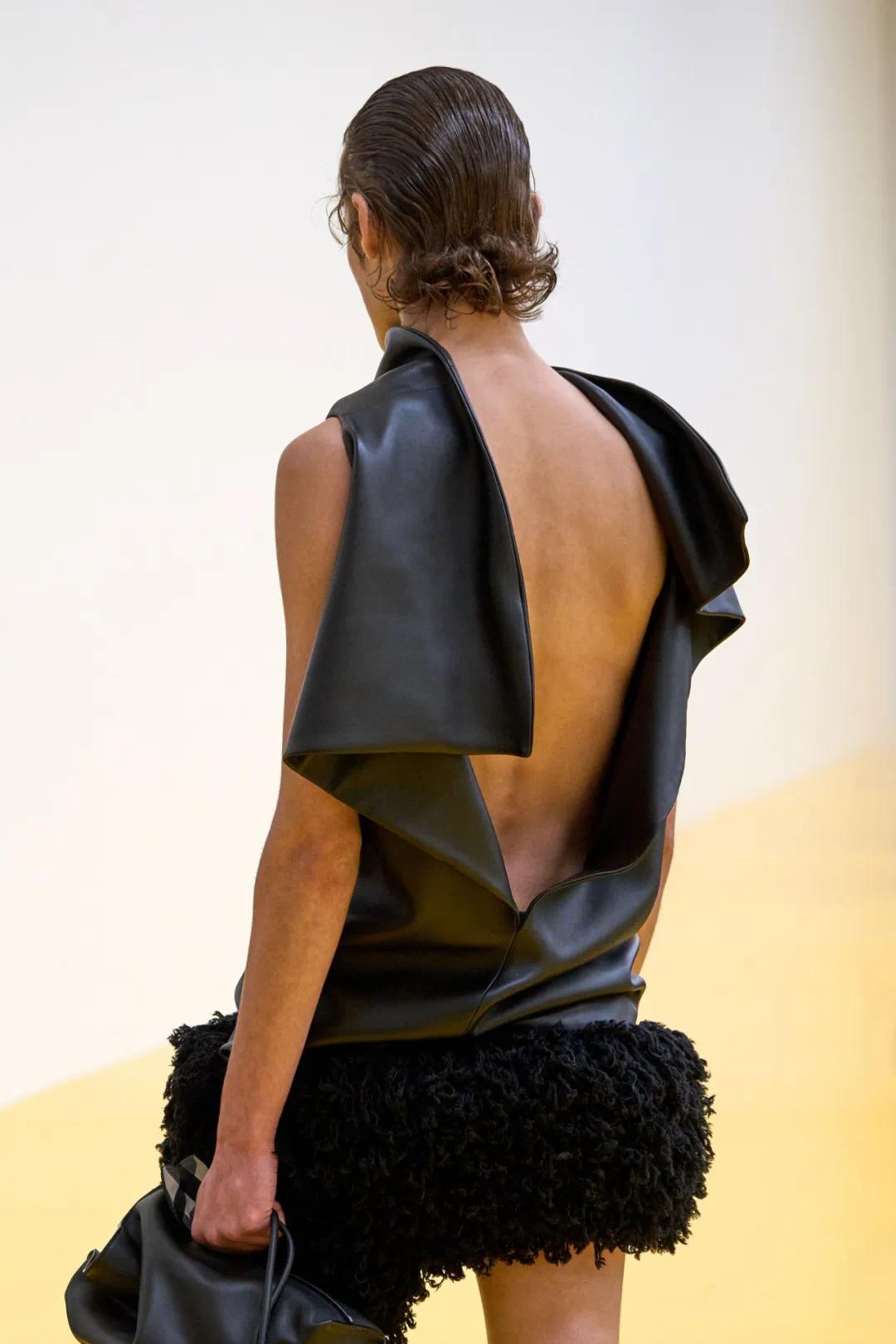 饰以蕾丝与蝴蝶结的吊带裙色彩明艳,其闪亮的外观极为特别,实则经3D打印复制后以乳胶浇铸,才能呈现出光泽流动般的质感;外套亦以类似手法重塑,仿佛以液态凝固。设计师以乳胶模拟亮面皮革的华丽外观,真皮革则不似皮革:环状漆皮打造的滚珠绒外套宛若皮草,超细皮革纱线织就的格纹毛衣与连衣裙如针织般毛绒柔软,染色羊毛皮外套的边缘特意处理成动物毛发般的渐层效果……这些充满幽默与机智的手法,为品牌注入全新的生命力。