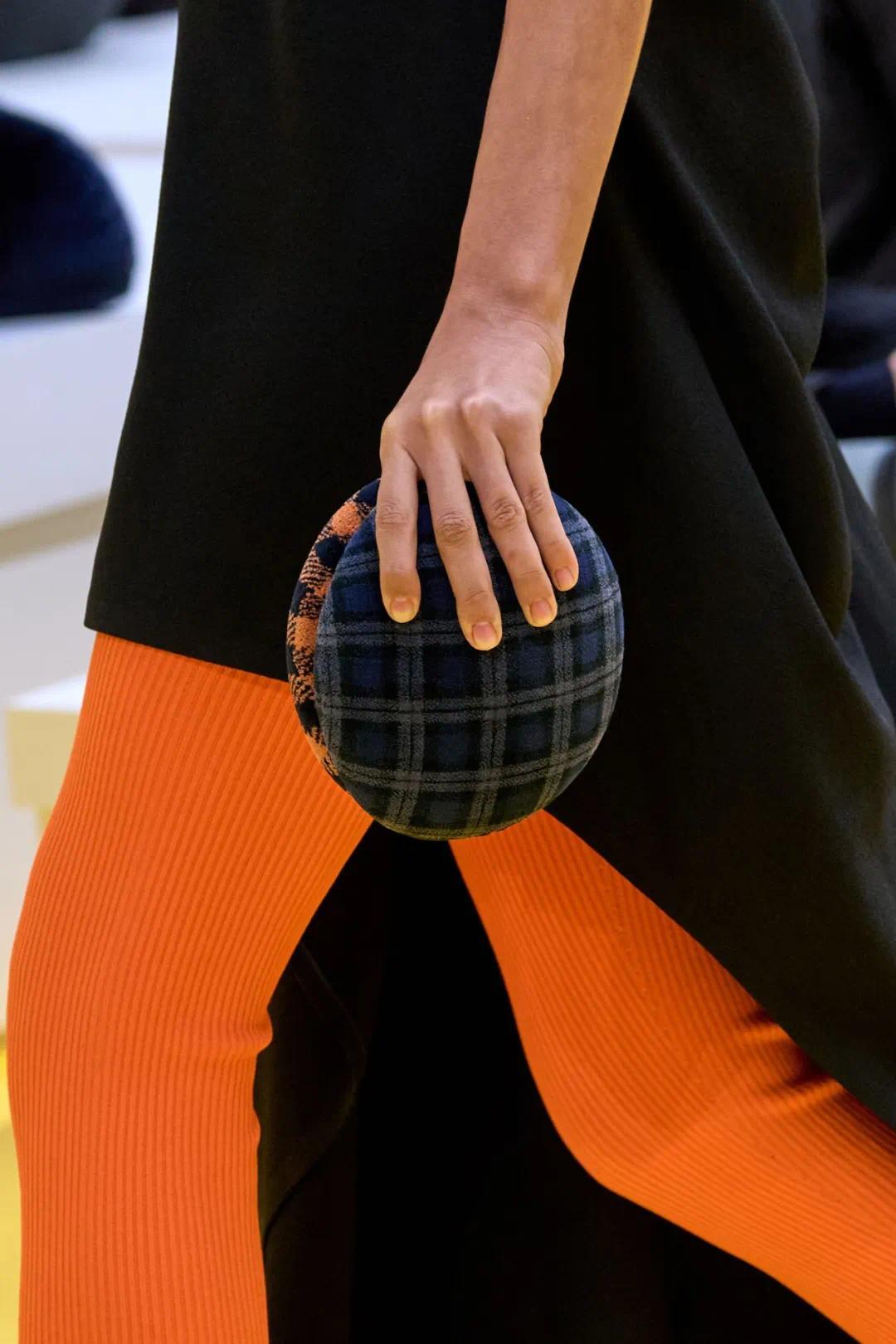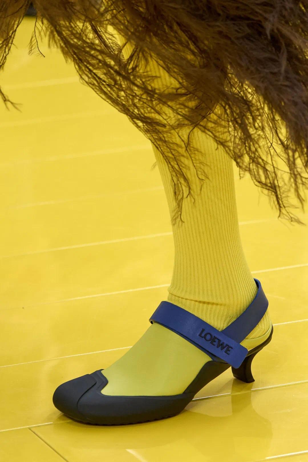 本季系列的颜色体系同样精彩!双人组合打破了秋冬季的低调配色传统,不断拓展色彩搭配的边界:鹅黄、亮红等明媚色彩彼此碰撞,深色套装与多色格纹层层叠加,渐变色皮毛外套与鲜亮漆皮裤高调碰撞,搭配同样明亮的橡胶模塑运动鞋与Dive露跟鞋……各式鲜艳色彩营造出欢快的视觉氛围,延续LOEWE一直以来的趣味基因和乐观精神。