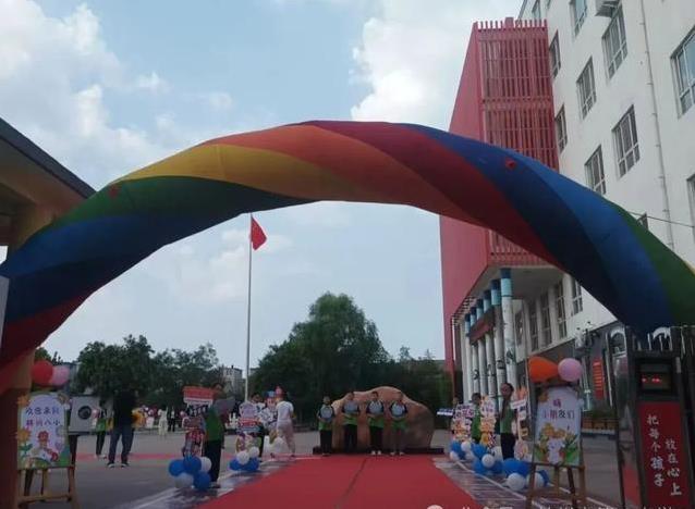 校园里,一道彩虹“启智门”立在操场上,五颜六色的气球和向日葵在阳光下格外鲜艳。孩子们排着队,小心翼翼走过这道门,像在跟新生活打招呼。老师们在旁边笑着,帮着调整队形,空气里满是温暖的味道。